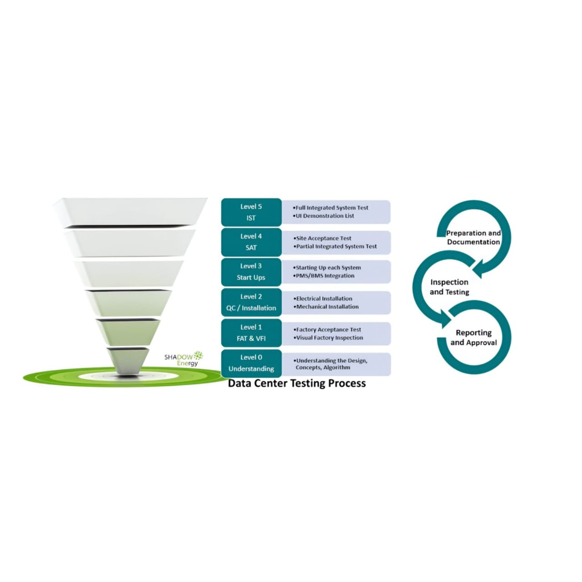 L5 Testing is the final stage of Data Center Due Diligence before full integration, focusing on BMS (Building Management System) verification and ensuring all tests align with design and operational scripts. This phase validates that the electrical and mechanical systems function as intended and meet compliance standards.
